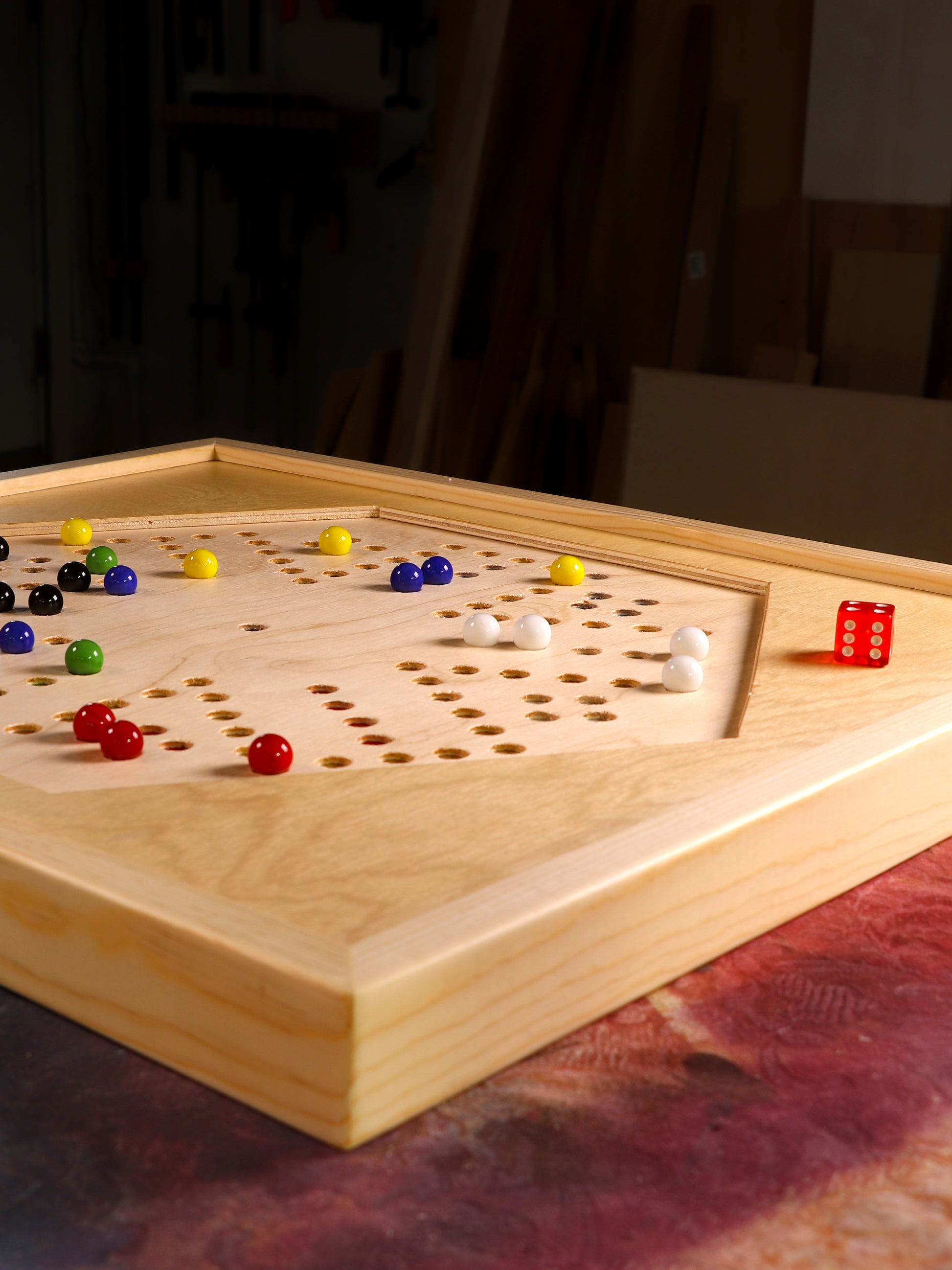 This version of the board game is made from three pieces of plywood, sandwiched together for strength. You'll drill the holes for the marbles using a handheld drill, though a plunge router or drill press could be used for more precision. The template for the holes is included in the plans.