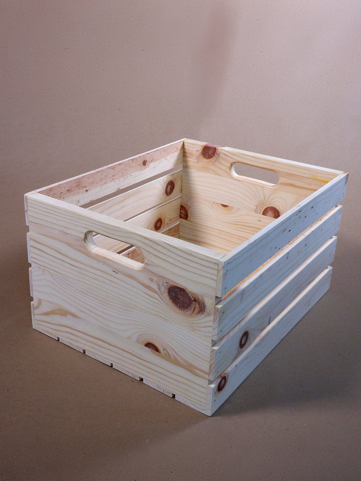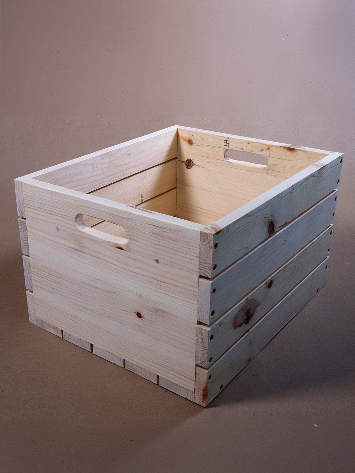 For a more traditional look, the advanced version uses thinner slats and requires a table saw. This crate is lighter and features precise cuts and assembly, with glued and nailed slats for a refined finish. It also includes rounded handles made with a Forstner bit and eased edges using a router. Both versions offer a rustic charm that can be left unfinished or customized with paint or stain. Download the free plans to start building your storage crates today!