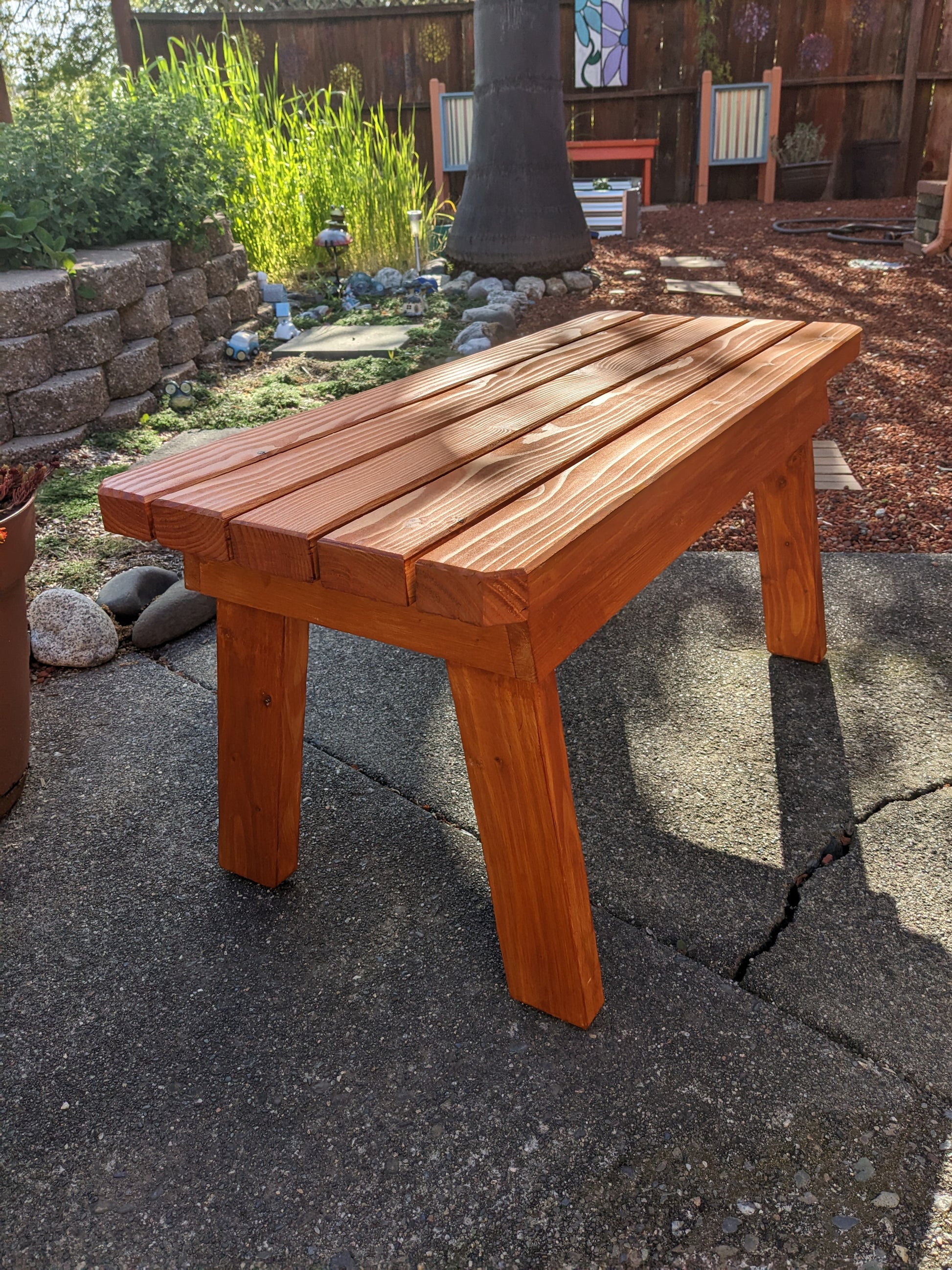This is a small bench, intended for a cozy nook where one or two people can sit to enjoy nature. If you want it a little longer, you just need to cut longer stretchers and seat slats. The angled legs give the bench a subtle, sophisticated look that elevates it from most beginner-level DIY benches, yet they are easy to make.