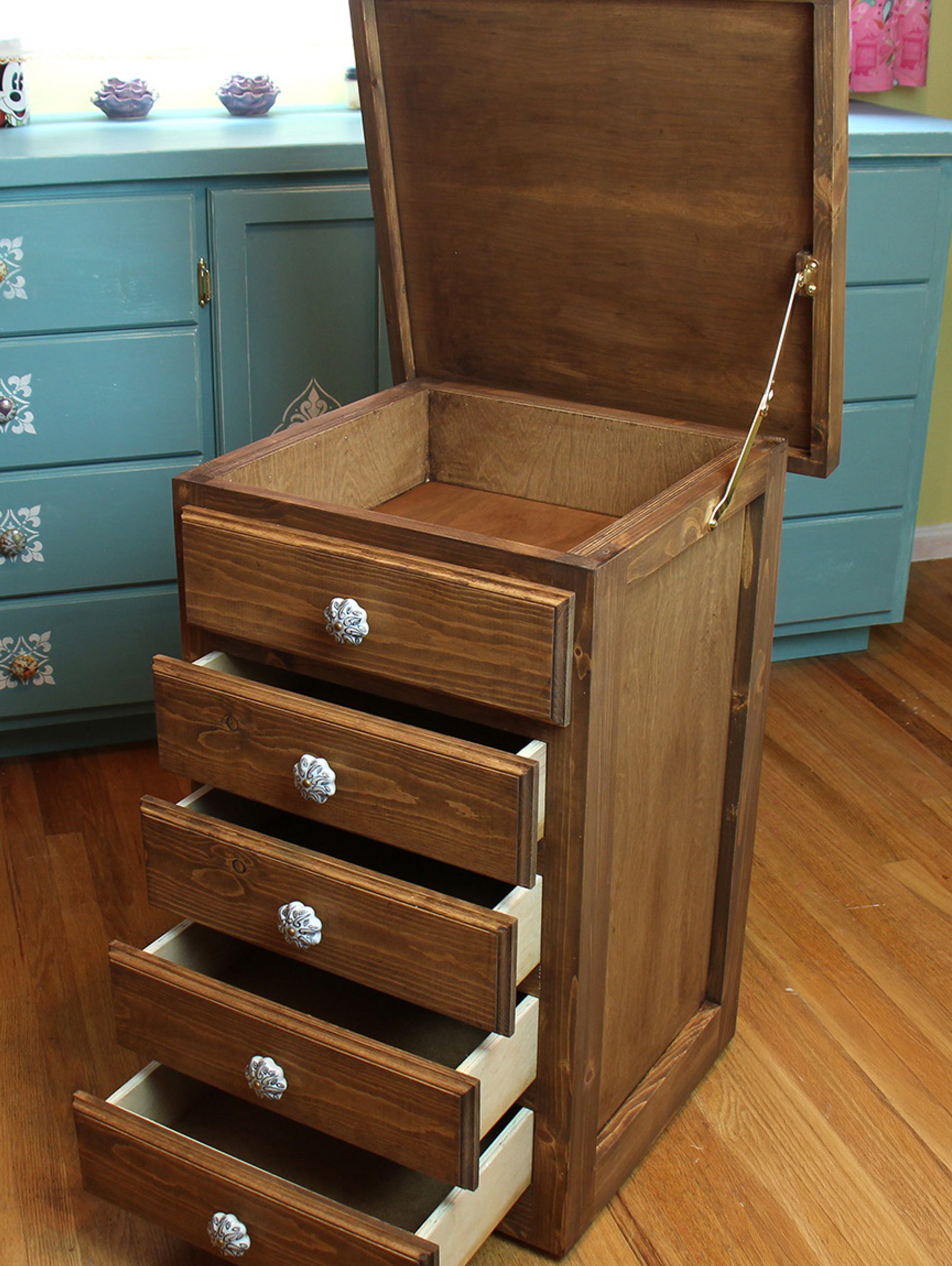 I made this as part of a craft room makeover in 2015. This mobile storage cabinet is used for storing sewing supplies. It features shallow drawers and a hinged top to store spools of thread. U.S. and Metric plans included in download.