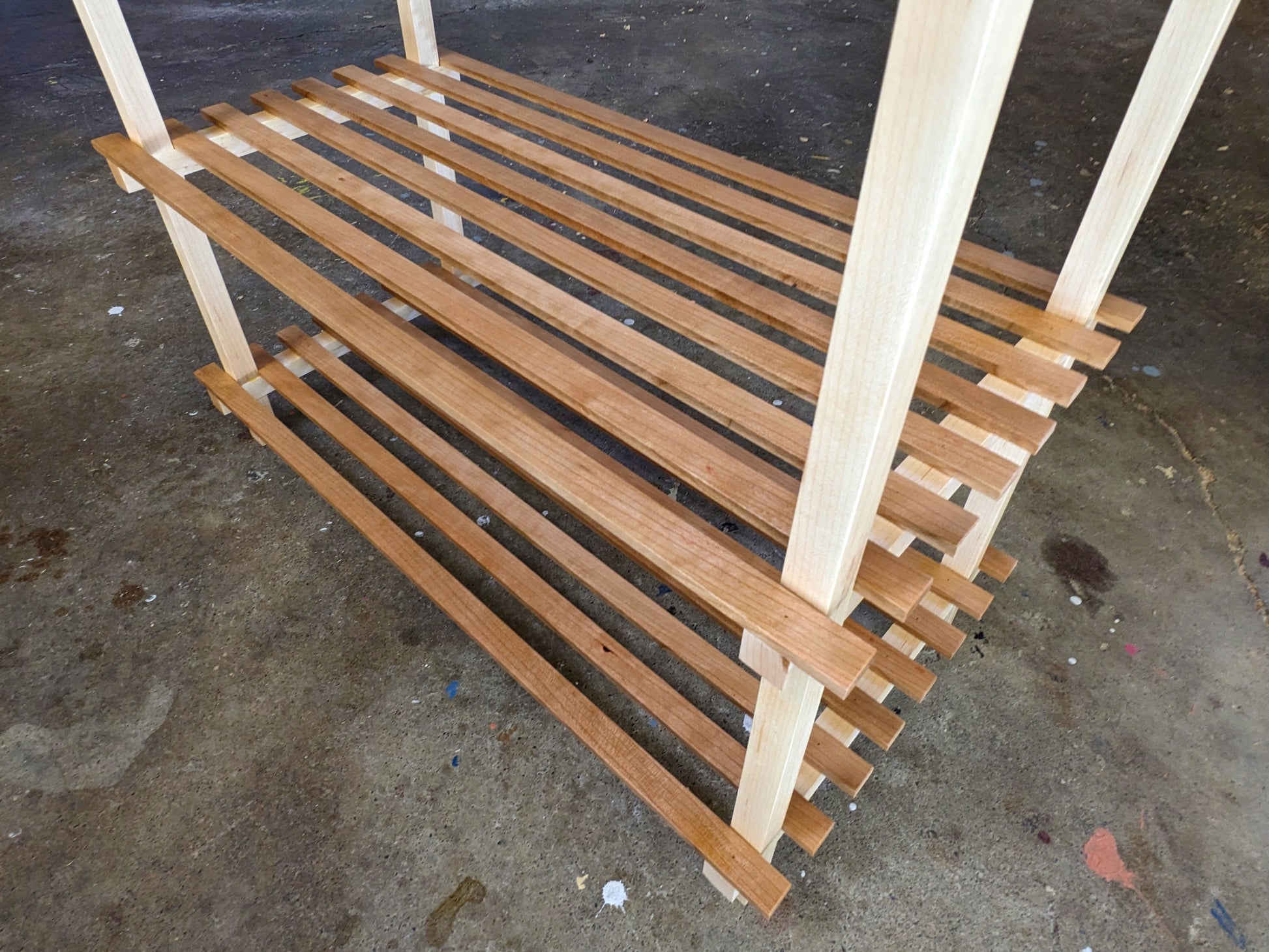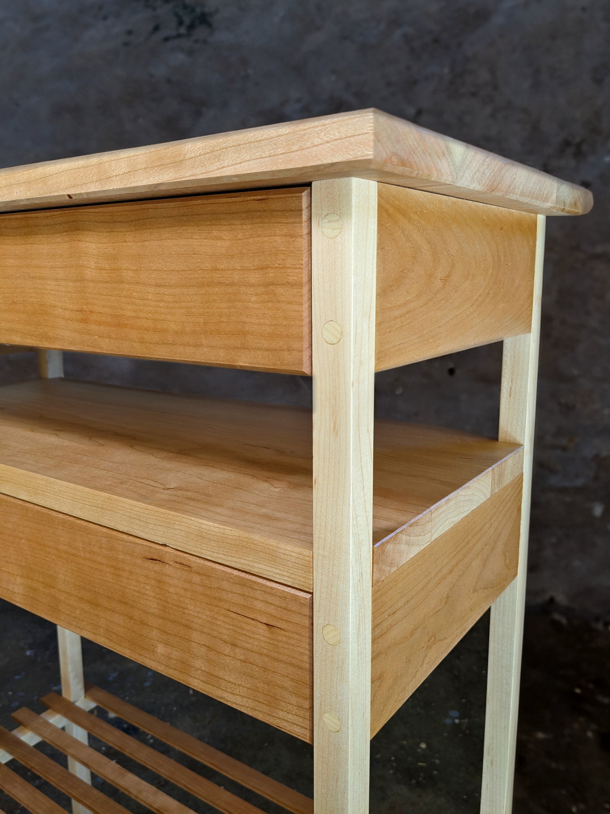 This piece is a perfect complement to my Contemporary Nightstands. The idea is that this piece of furniture takes up a small space, but is sort of a staging area for starting your day. You might use it to lay out clothes before bed, or use the top as a place to set a jewelry box, fragrances, or whatever. The two “hidden” drawers (not really hidden lol) are great for stashing accessories or personal items and there's a shoe rack that can hold at least four pairs of your most frequently worn shoes.